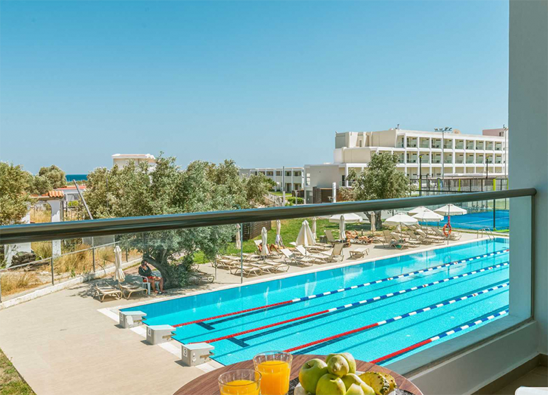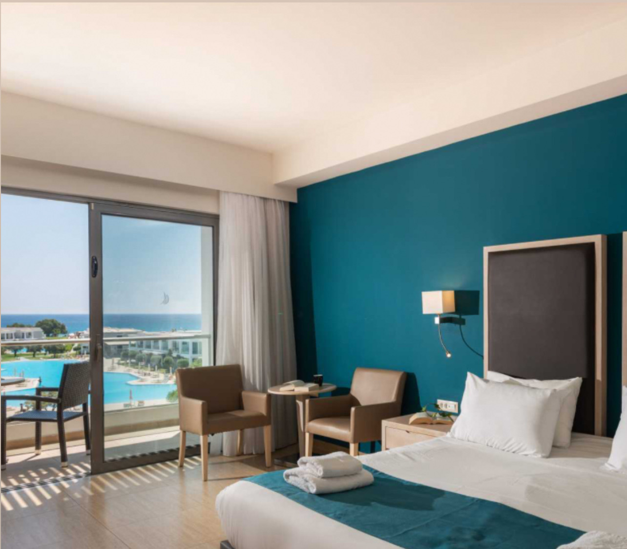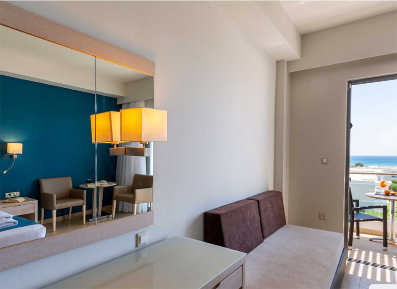 Dubbelrum med balkong eller markterrass. Vissa balkonger har poolutsikt, havsutsikt eller begränsad havsutsikt. En dubbelsäng eller två enkelsängar. Möjlighet till extrabädd i bäddsoffa. Wifi, luftkonditionering och deponering ingår. Kylskåp. Vattenkokare. Tv med internationella kanaler. Hårtork. Badrum med badkar eller dusch samt wc. Städning 7 ggr/vecka.